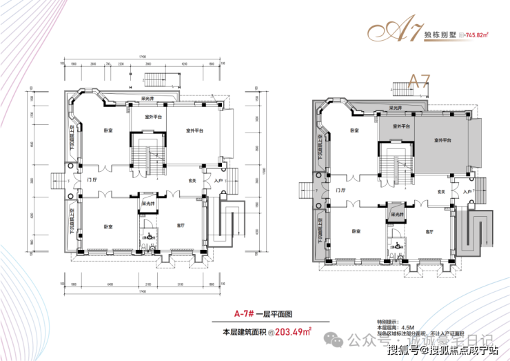 布局:地上三层(4.5米层高)+地下一层(6.2米层高)+900㎡花园