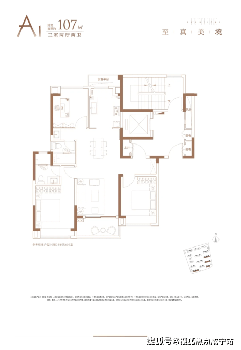 约107㎡三房两厅两卫户型,采用一梯两户设计,飞机户型格局方正,约9.8米三开间朝南,采光通风俱佳!