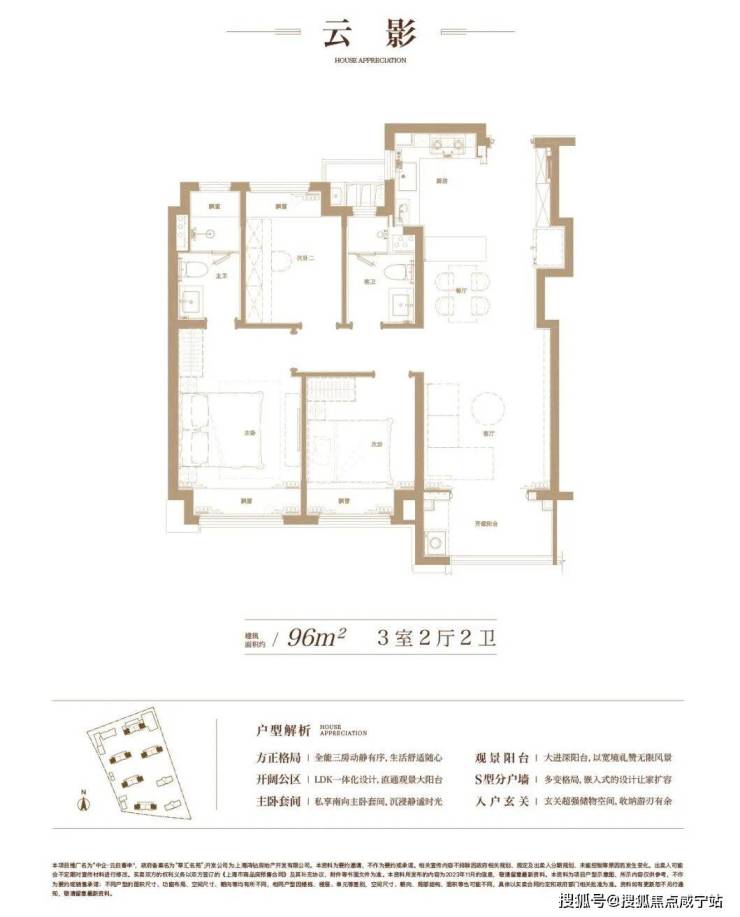 建面约96㎡3房2卫户型,三开间朝南,全卧室带飘窗。整个户型的采光、视野非常出众。