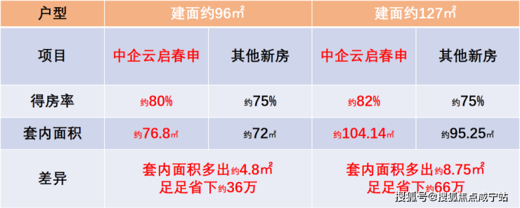 同样面积的户型「中企云启春申」比其他新房多出了约4.8-8.75㎡的套内面积。换算到约7.5万/㎡的均价,那可是大几十万的真金白银。