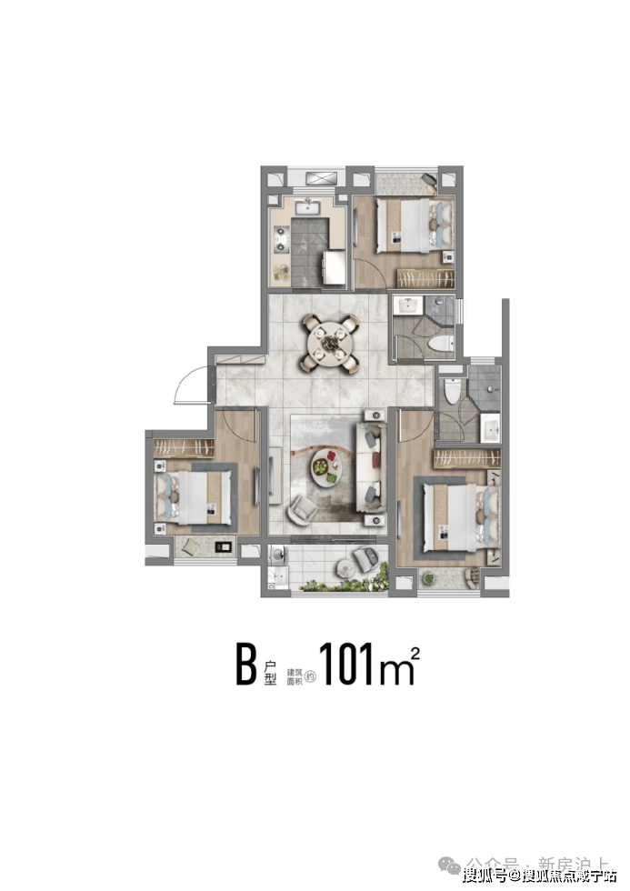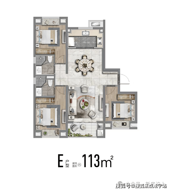 也有建面约113m²舒适性三房,南北通透;飞机户型,房间分列两侧互不打扰;卧室空间也相对更大、更舒适。