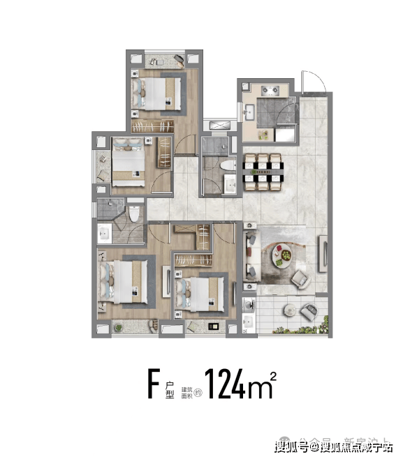 建面约124m²四房,市面常见的四房普遍要135平,这个约124平米户型功能性拉满,且控制了总价,给予更多小伙伴一步到位的机会。