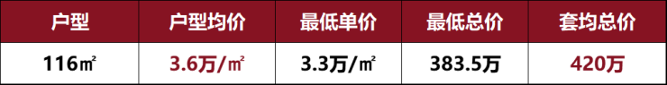 从一房一价表来看,项目首开均价仅约4万/㎡(约39960元/㎡),建面约116㎡户型单价更是仅约3.6万/㎡!