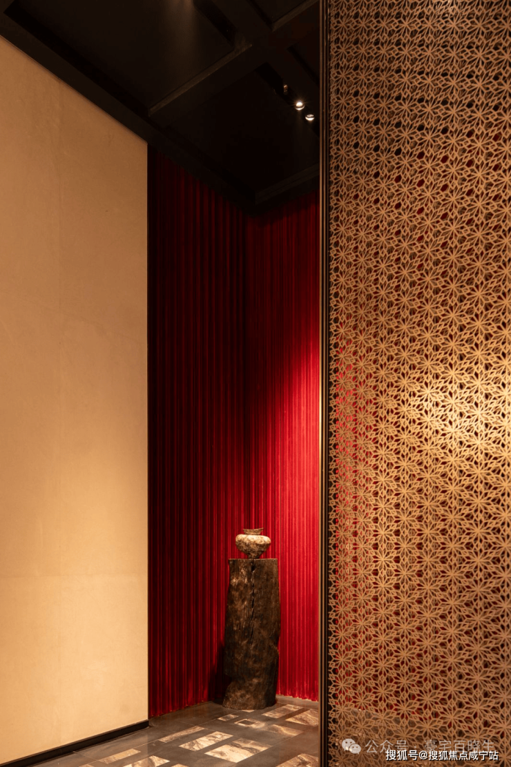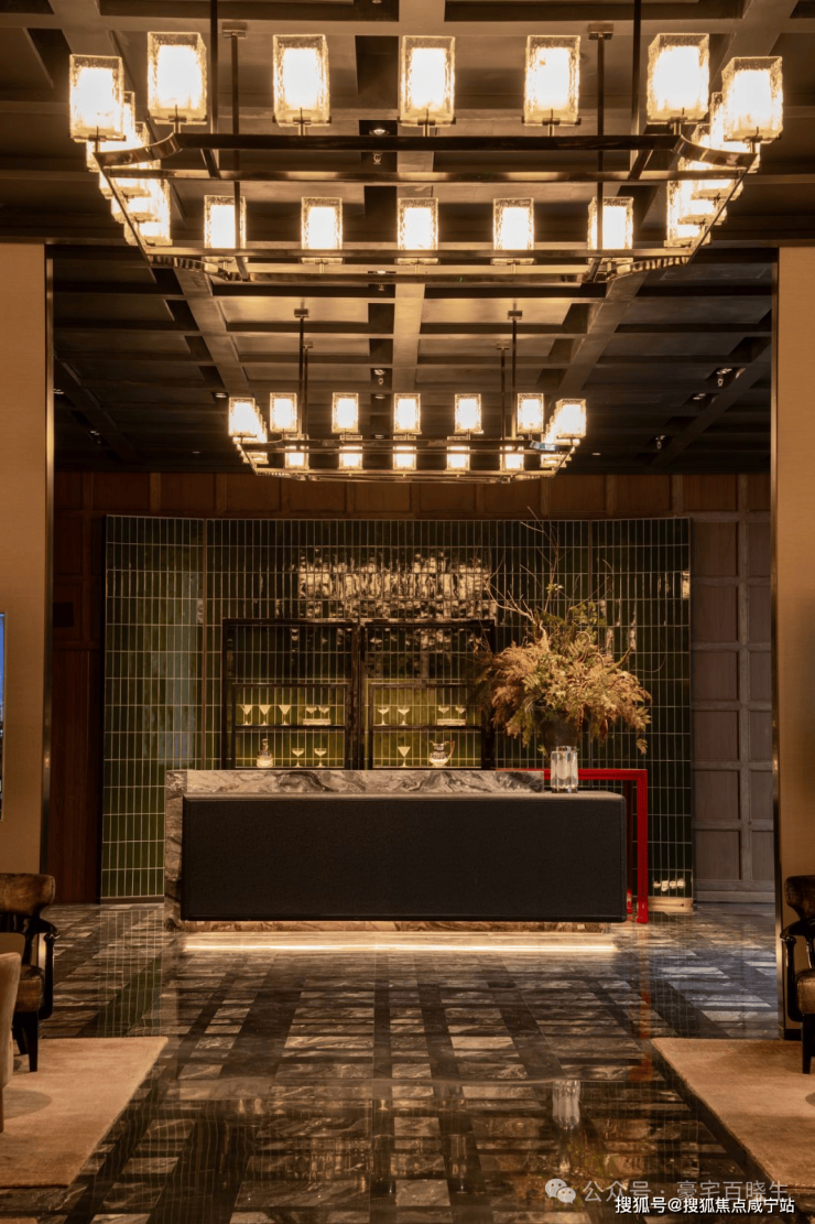 l又如拾玖间地下会所水吧背景墙的景德镇冰裂瓷,近千度窑火烧制,诉说时间的答案;会所中大量软包皮革,采用雕花皮革纹,道道工序,样样精心,结合当代摩登美学,营造值得经久回味的本色。