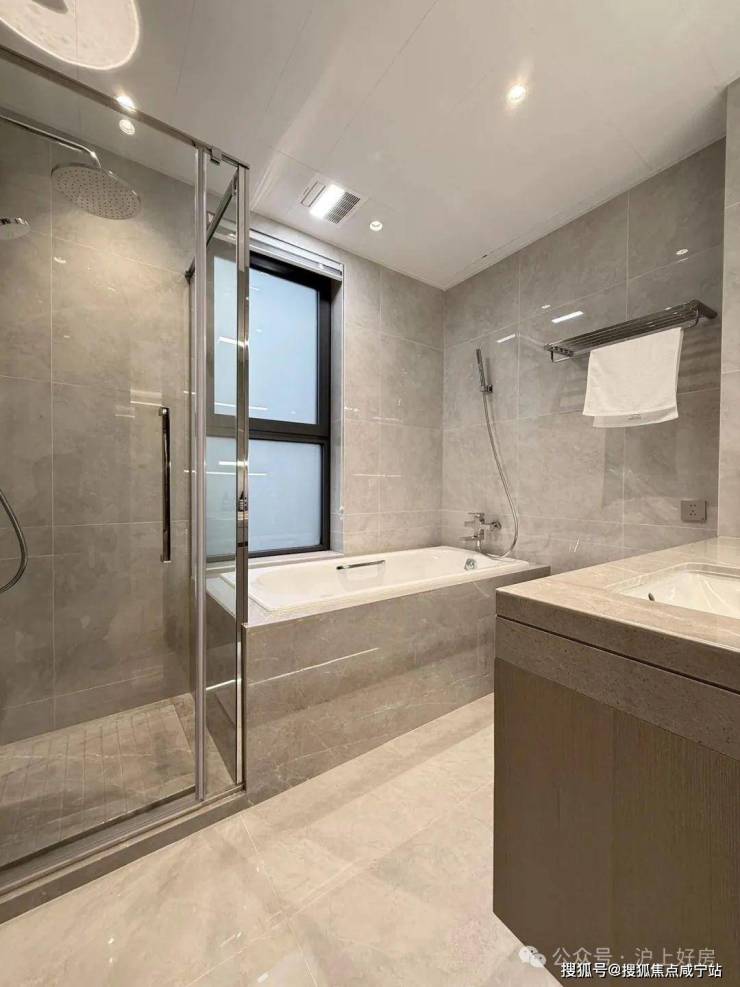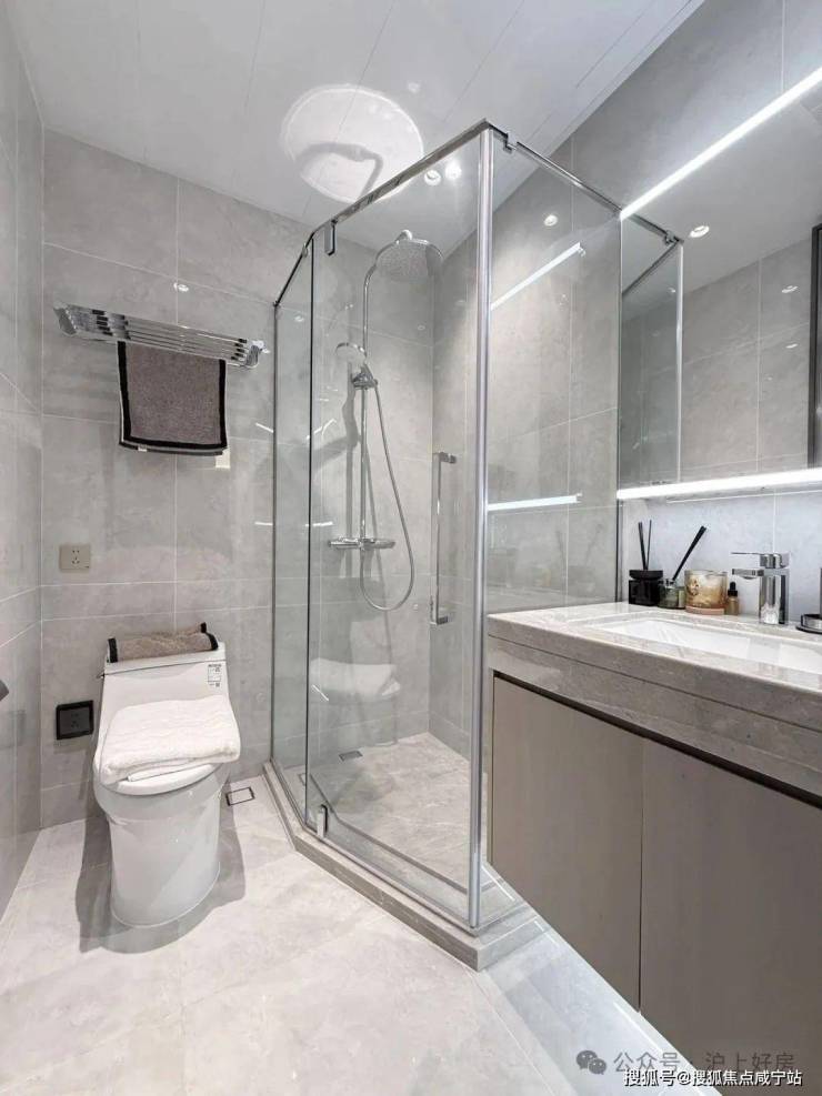 另外,一般百平米主卫淋浴房都是钻石型的,但项目是“一字型”的。“一字型”相比“钻石型”,洗澡空间更大,哪怕带着小朋友也不用挤得“转圈圈”,舒适度提高了不止一点点。