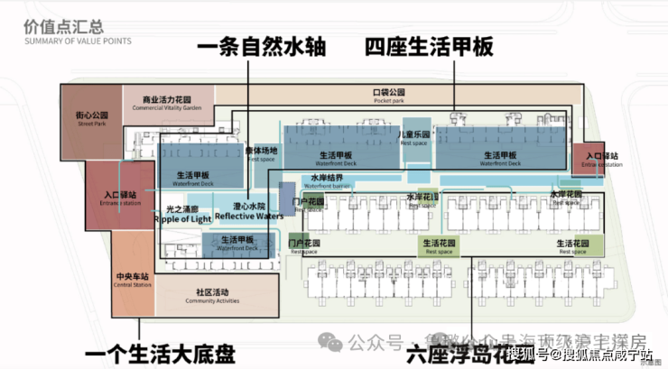 以自然水系为界,生长为独立的城市岛屿,通过六大景观节点,浮水之门、光之通廊、澄心水院、岸野森活、溪语花境、林语归岸,具象生活本应如流水般自在从容。