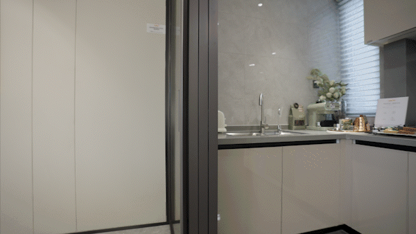 开放式设计搭配四折式移门,减少视觉隔断,透光不透人,将生活与油烟彻底隔开。