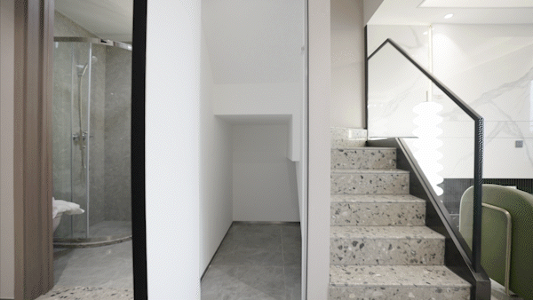 楼梯踏步铺设岗石石材,并将扶手升级为超白玻加木制扶手,楼梯改造后无卫生死角。