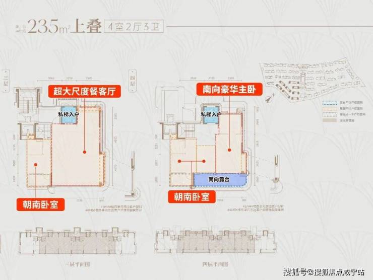 上叠功能性与下叠看齐,也是四个朝南的全明卧室,主卧豪华套房配置,外接南向超大露台,观星品茗无比惬意;