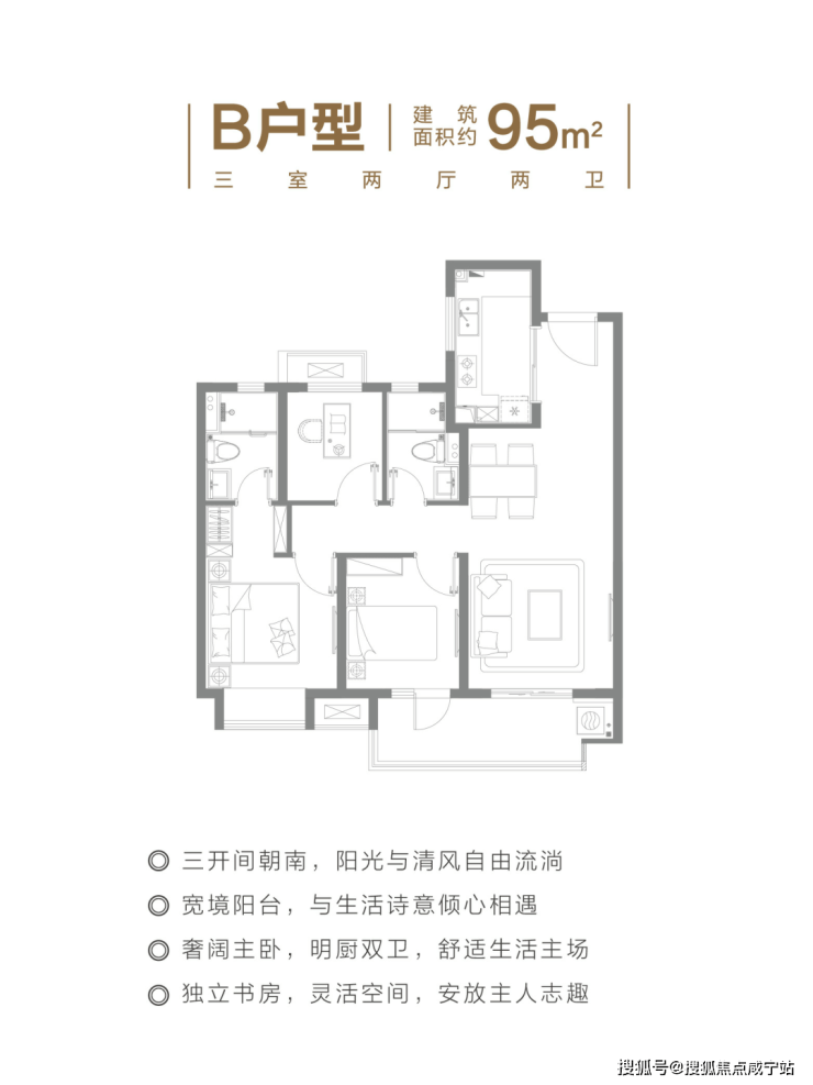 建面约95㎡的3房2厅2卫户型,这个户型的实用性太高了。能保证业主从二人世界到二胎家庭的全生命周期需求。