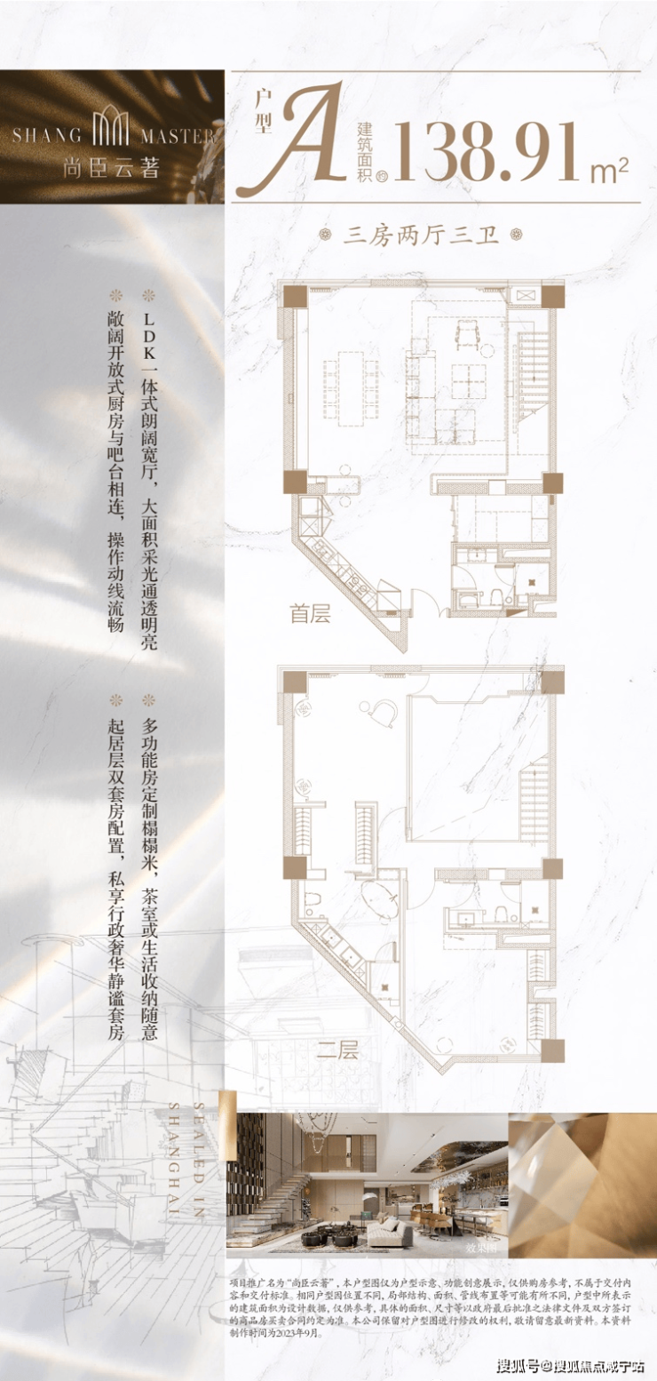LDK一体式朗阔宽厅,大面积采光通透明亮,敞阔开放式厨房与吧台相连,操作动线流畅,多功能房定制榻榻米,茶室或生活收纳随意,卧室层双套房配置,私享行政奢华主卧套房。
