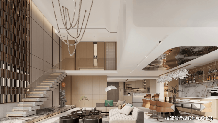奢阔宽厅,大面积玻璃寰幕墙映衬繁华街景,客厅挑空设计,更具空间感的大气朗阔感受,吧台连接陈列展示区,增添优雅的层峯底色,独立卧室层,三间套房奢华配置,尊享静谧。
