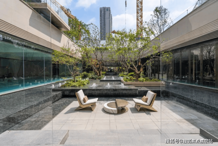 最后来看泳池。云邸玖章做了再升级。改为采用大尺度的落地玻璃拼接,约2.4米宽巨幅玻璃,且通过精致的玻璃交接细节处理增进室内外空间的融合,强调泳池的无界感,真正实现了无边泳池的效果、质的飞跃。