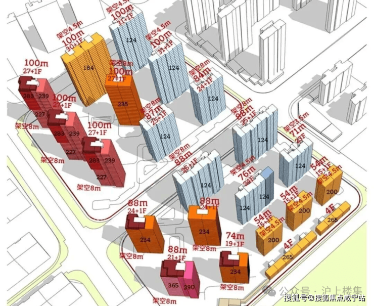 根据项目规划设计方案,07-01地块拟建9幢25-32F的高层住宅、若干社区配套用房以及部分商业设施,共计规划约794户。;全部楼栋均采用一层架空设计;