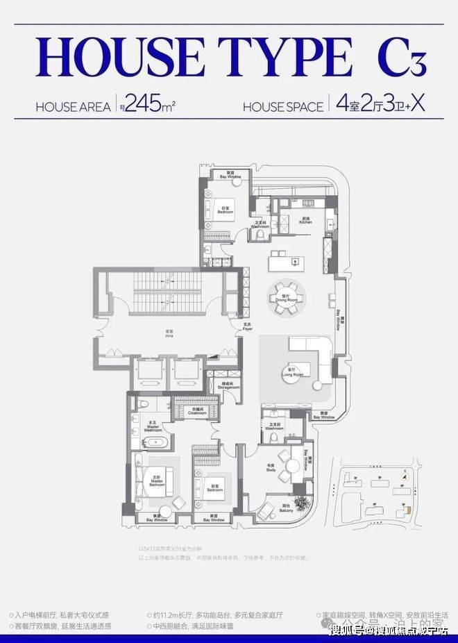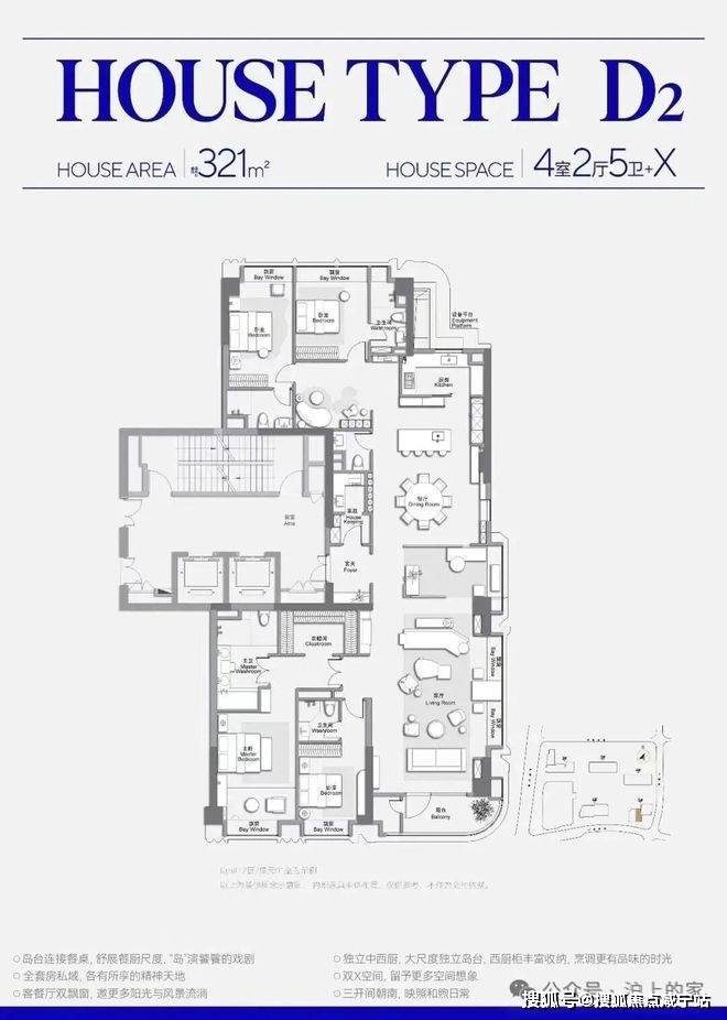 独立的中西厨,独立岛台,客餐厅一体化,这种设计一般250平以上户型都有。