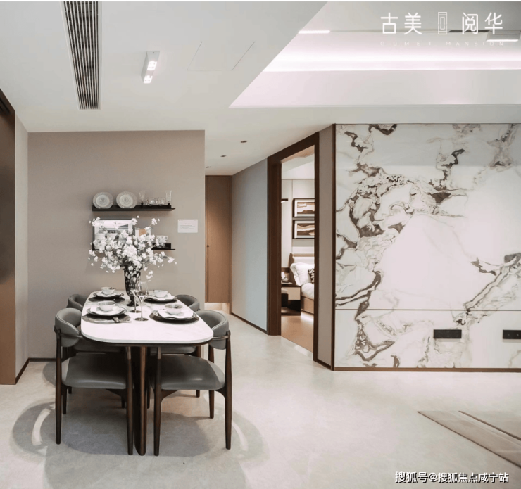 古美阅华在装修上使用大量奢石元素,凸显尊贵的艺术格调比如客厅背景墙、厨房挡油板选用了芬迪白岩板,浴室柜台选用了原产地为意大利的烟雨江南石材。