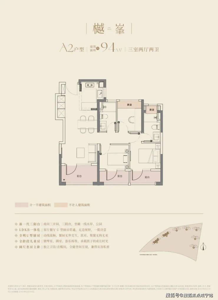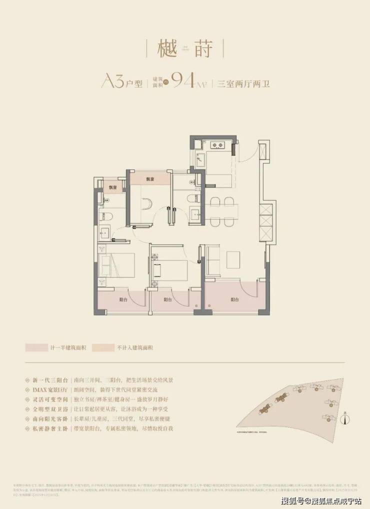 大华望樾建面约94㎡高层户型居然做到了三阳台的配置,远远超过新规标准。