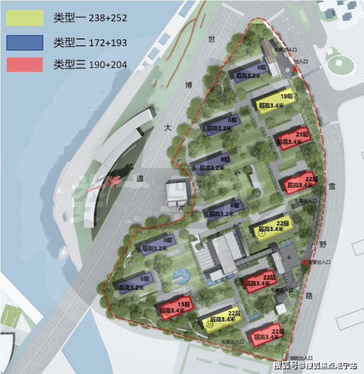 项目西侧沿江布置6栋8层住宅,其中靠世博大道5栋为保留建筑,东侧沿雪野路定位布局为高层住宅,形成西低东高布局,大程度上利用江景资源。
