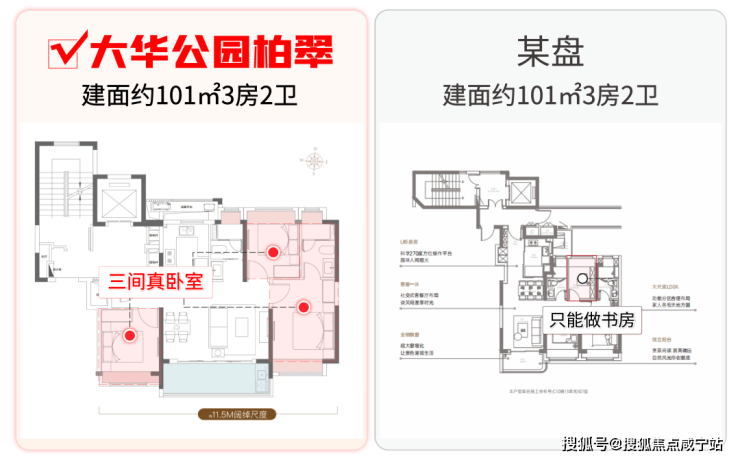 相比竞品户型的 2房+1个功能房 ,其功能性天壤之别。