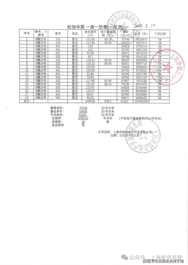 上期一房一价表如下
