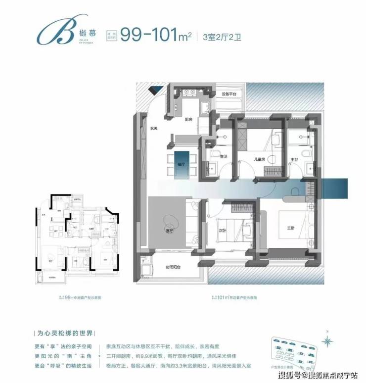 方正格局,全明南北通透。客厅朝南,两个卧室朝南,三开间全部朝南!客厅连接270°景观阳台,让每天的生活,沐浴清风阳光。