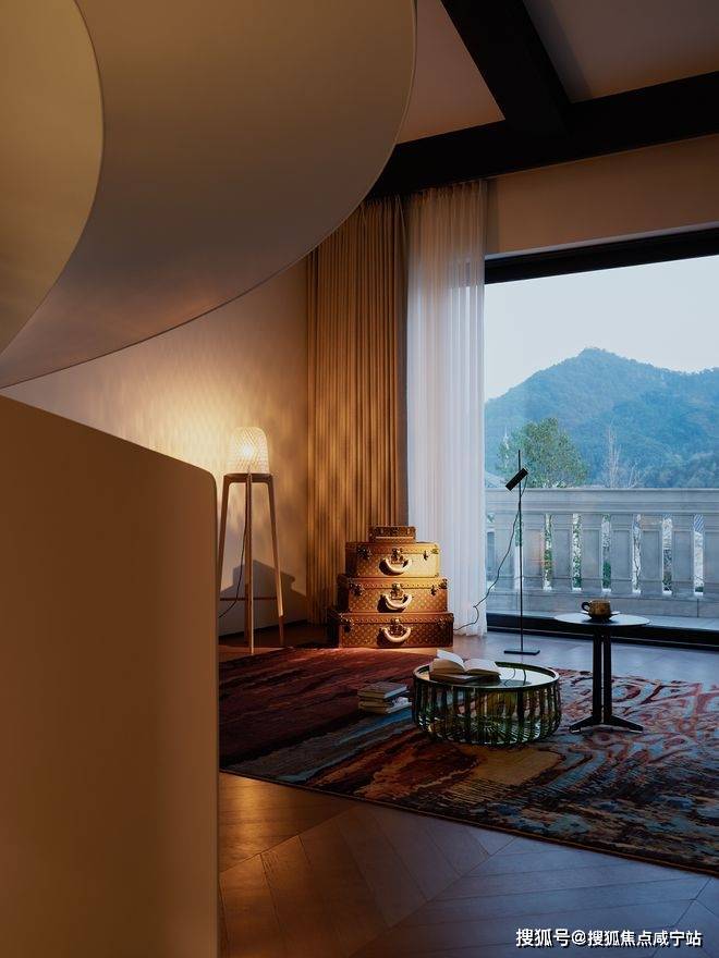 三楼围绕家庭起居厅布置卧室。卧室的地毯是由黄亚兰原创设计的《流动的暮色诗境》,精致的家具与手工羊毛地毯温柔包裹新生家庭的私密时光。