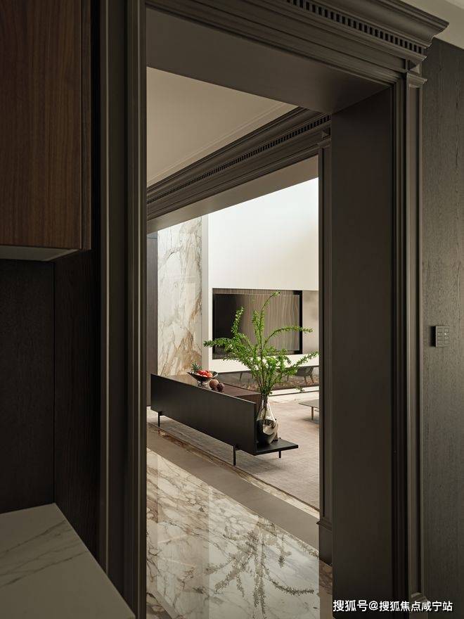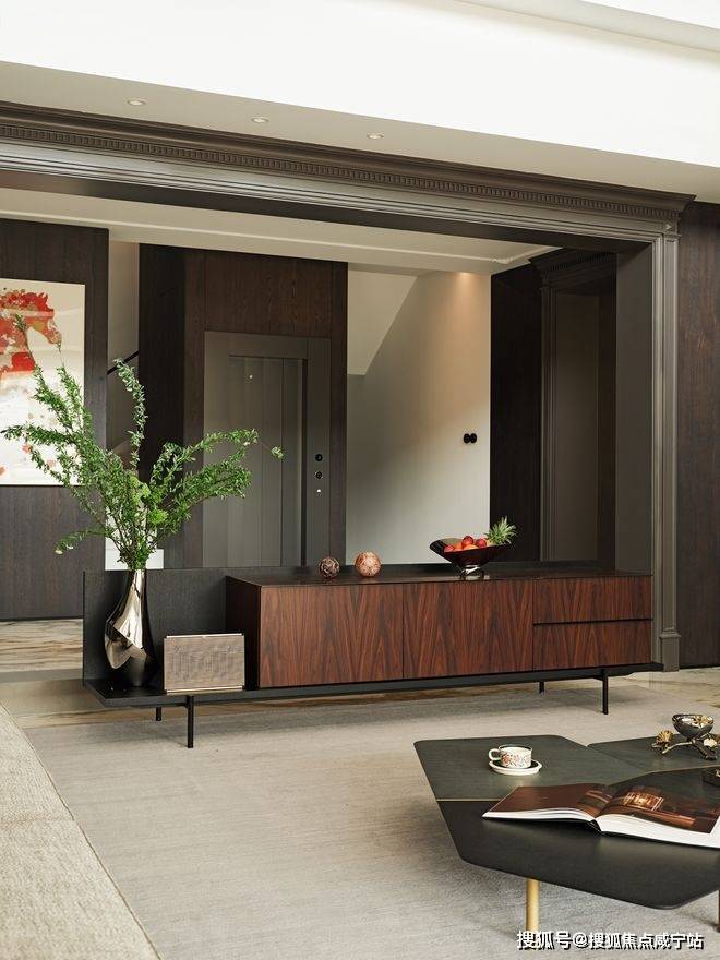房子内部以“垂直生长”回应家族生命周期。一楼作为家庭社交中枢,6米多高的挑空客厅以卡拉卡塔金大理石纹为幕,石材纹理如水墨恣意流淌,灰色的手工地毯以“时光的褶皱”为精神内核,与Minotti的家具构成刚柔对话。