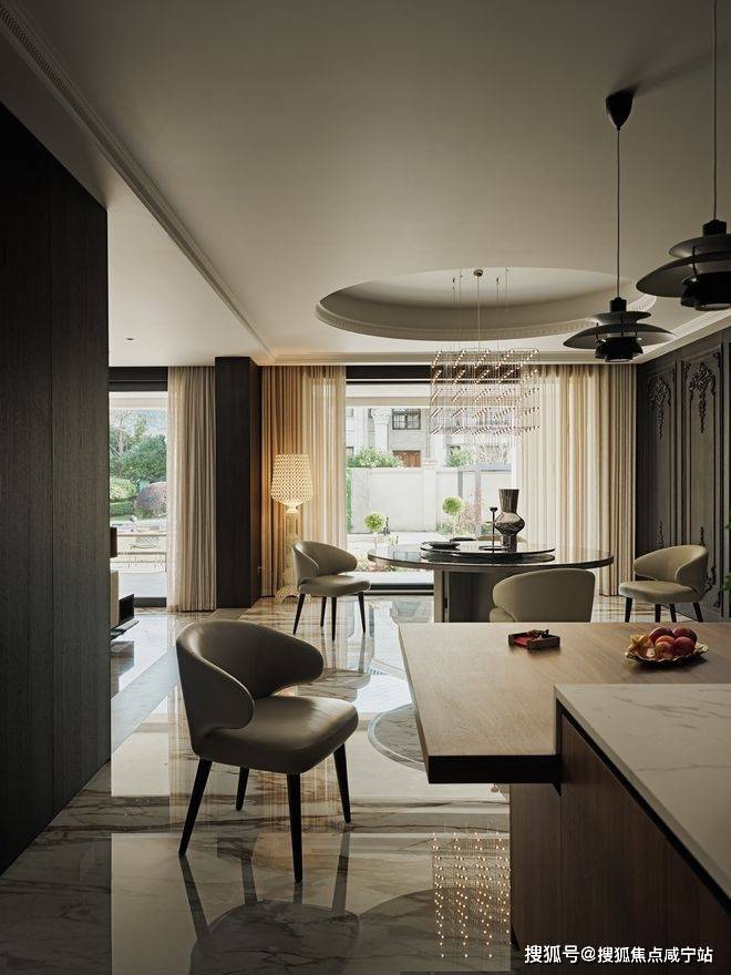 中西双厨选用Dada橱柜,岛台延伸作为早餐和休闲区,10人位的圆形餐桌,暗合东方“团圆”意象,落地窗将客厅、餐厅、茶室与南花园串联为流动的整体。