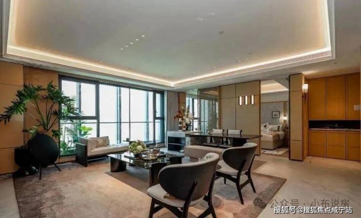 约6.4米的超大横厅连接南向双阳台,形成约37㎡的阔绰方厅,满足家族欢聚与高端宴请需求。