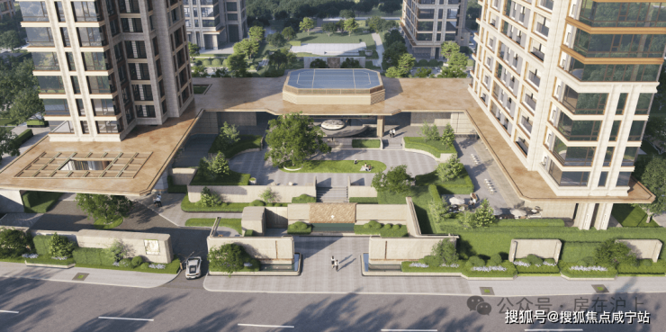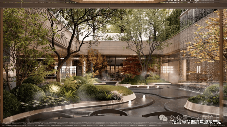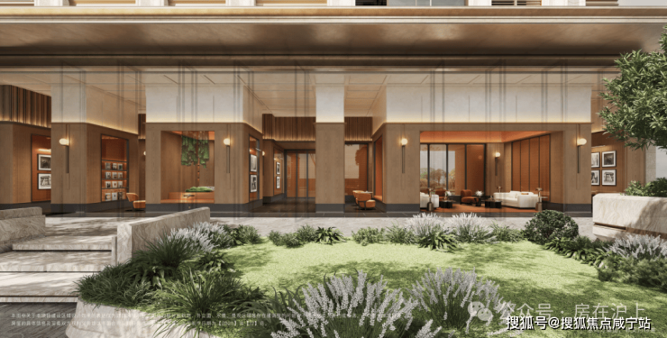 项目另一大亮点在于东侧主入口的设计。不同于常规门头,项目采用四进式布局:从标志性的“玖系”隐奢门头启程,经过仪式感十足的公馆草坪,再到营造社交氛围的聚场空间,层层递进,步步皆景。