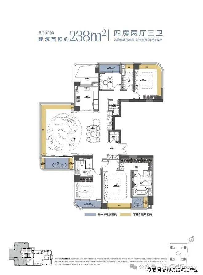 比如这个建面约238㎡户型,采用环幕设计,将徐汇滨江城市景观、下沉庭院等自然与人文景观尽收眼底,营造沉浸式居住体验。