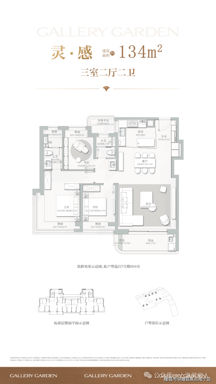 建面约134㎡3房2厅2卫,主力总价约1500-1700万,户型设计在上一个户型的基础上将各功能间尺度升级的同时,也做了一些更人性化的迭新。