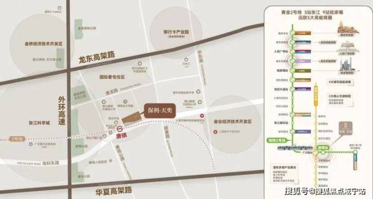 交通方面,该地块算是唐镇地铁上盖项目,与2号线唐镇站直线距离约200米,南侧紧贴着高科东路。通过2号线,2站金科路站,3站张江高科站,9站陆家嘴。
