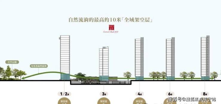 公园嵌入式浮岛社区:全域约 6.3米 -10 米架空设计,让公园绿意与山水诗韵自然邀约入室,打造公园嵌入式浮岛社区,呈现无界的社区风景。规划缤纷童趣、社区会客厅等多元架空层空间,于此开启生活的温暖缤纷。