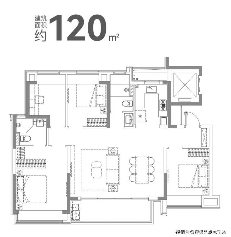 项目充分利用小高层+一梯两户的高得房率优势,不仅以建面约120㎡的面积,做出了媲美市面上建面约130㎡尺度的4房户型,而且还设计了南向超大横厅,如此兼顾实用性与尺度感的户型实属罕见,非常适合改善置业的客户。