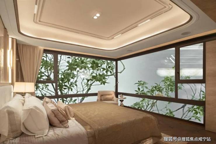 奢石材质与升级定制体系上,主卧标配约4.6米超大面宽贝母马赛克弧形皮革背景墙,地面采用和保利世博天悦顶豪项目同款的 嵌铜荷叶拼地板 ,每一处细节都拉满顶豪质感。