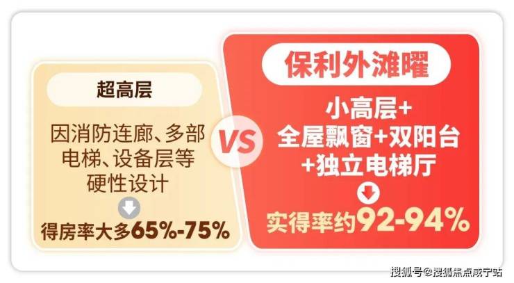 而保利外滩曜更是做到了: 项目全系户型标配“ 全屋飘窗(全赠送且可改造)+双阳台(半赠送)+独立电梯厅 ”,实得率高达约92-94%。