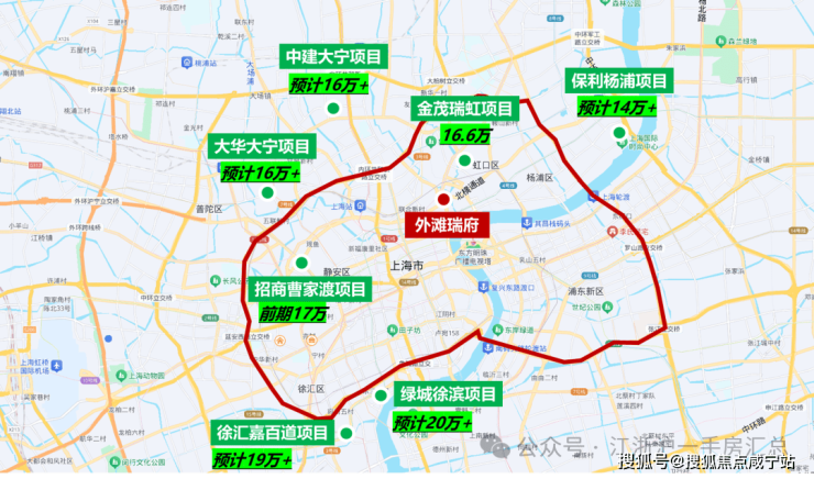 今年六批次土拍,绿城竞得北外滩新宅地,溢价率超过46%,未来售价预计突破20万元,它的位置就在「外滩瑞府」东侧约1KM。