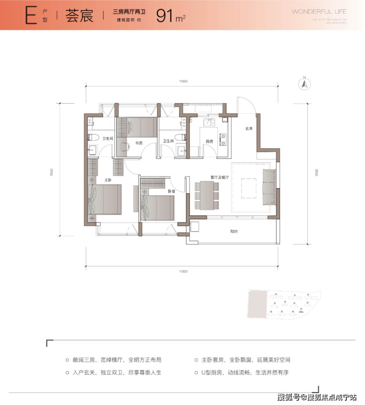 项目主力户型建面约89m²3房2厅2卫,近10米南向面宽,约6.3米的超大阳台打造更舒适的空间尺度感