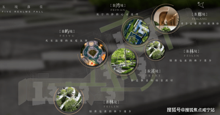规划了“翡色五境”五大空间氛围,匠造融入时光、人文海派、自然与艺术、家庭与邻里的“四轴、三园、五区、一所”四大功能空间。