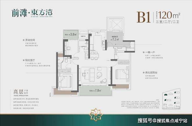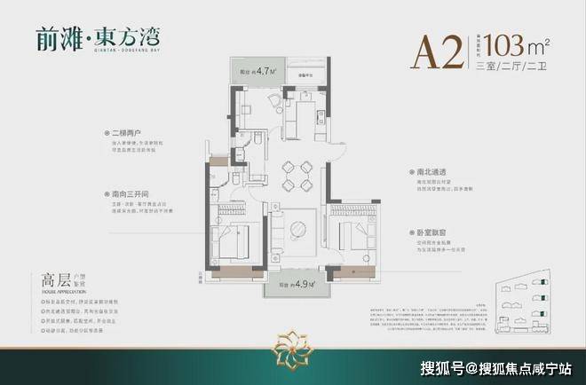 户型建筑层高3.1-3.15米,无连廊,双阳台配置。其中建面约103平户型2梯2户,其余一梯一户。