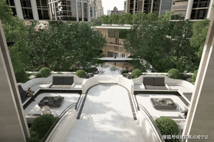 穿过园林,上海最大的约3500㎡下沉水院构成社区的核心灵魂,约13米的高差形成独特的“峡谷绿洲”,将黄浦江的水意象引入社区,中央平静水面与四周的会客舱、茶室、游泳馆形成呼应。