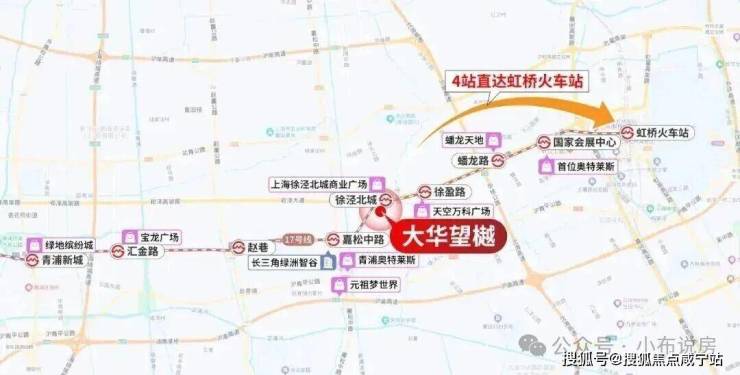 项目地块北侧紧邻17号线徐泾北城站,1站可达徐盈路天空万科广场,2站至蟠龙古镇商业区,3站直达国家会展中心,4站即达虹桥枢纽。