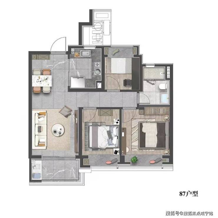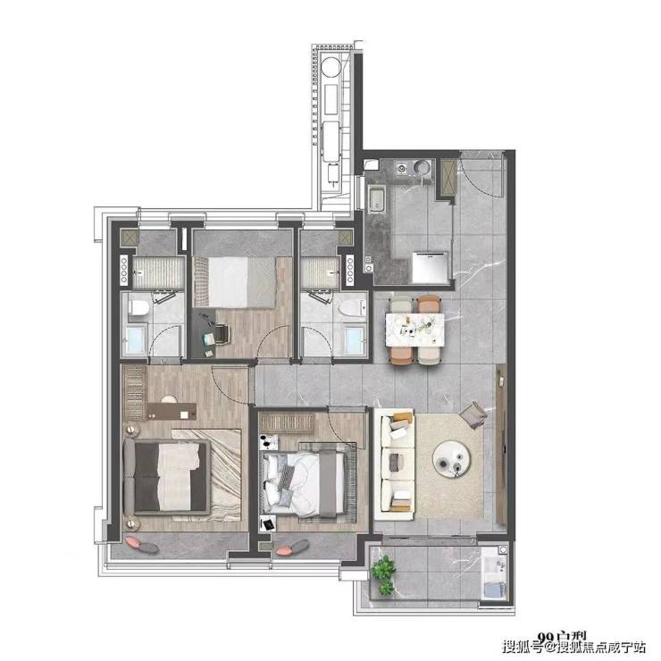 建面约99㎡的三房设计,在空间上使用功能更加多样化,一站式解决了家庭生活的所有功能,优化居家动线,大大提升空间的居住体验。