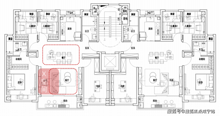 一梯两户,四叶草户型,三开间朝南,全卧飘窗,约5.2米小横厅!