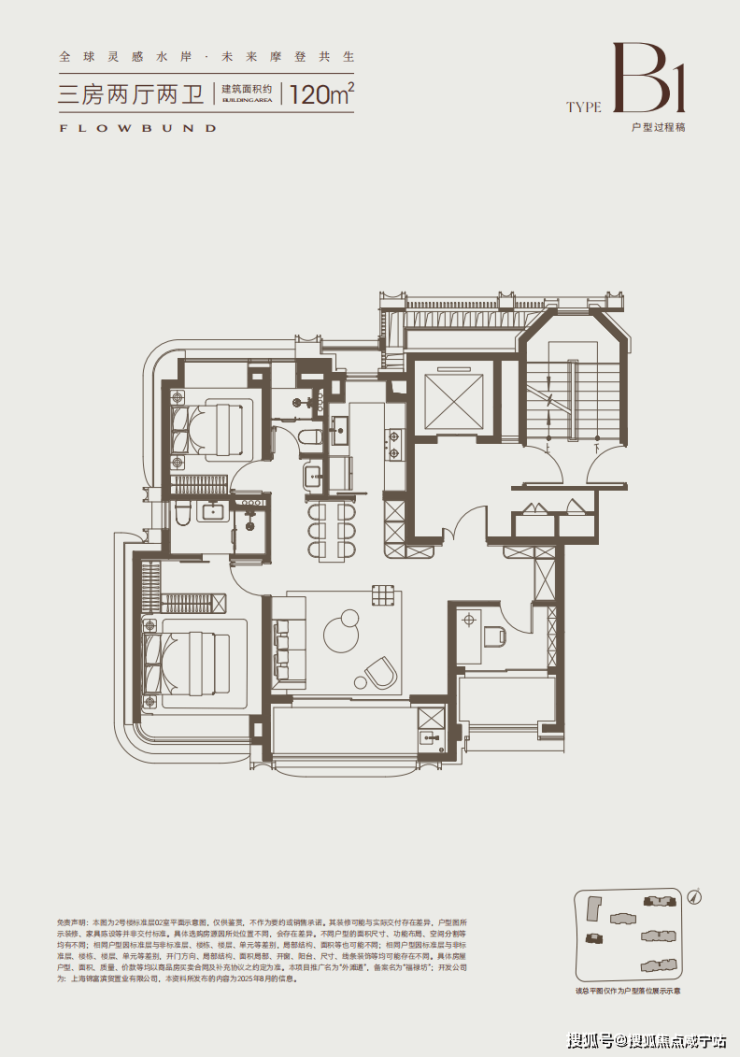 建面约120㎡的大横厅、双阳台产品,并没有勉强去做4房,而是打造了一个超宽绰的3房产品。
