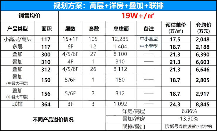 据项目最新流出的产品规划及定价方案:项目整体采用“高低配”方案,产品包括洋房、高层、叠加、联排,未来售价可能在20w+!