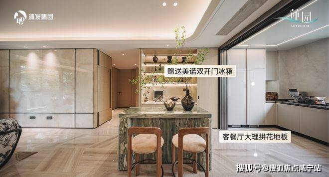另外,客餐厅地面采用大理石拼花地板,厨房除了常规燃气灶、橱柜等还赠送美诺双开门冰箱