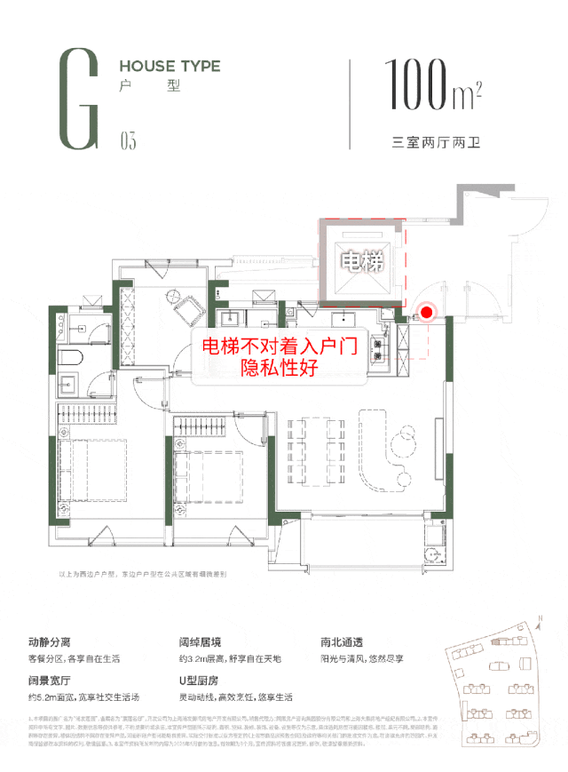 建面约100㎡GH户型公共区域电梯门侧对入户门,隐私性得到更好保障,其中G户型01室更类似于一梯一户,这在百平米市场独树一帜。