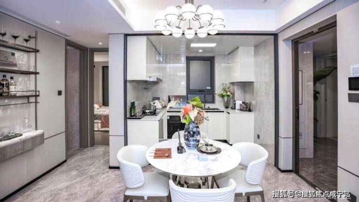 LDKG设计,让客、餐、厨、阳台四个空间打破传统布局中的“隔阂”,几个功能区独立又互通,将空间功能进一步放大。